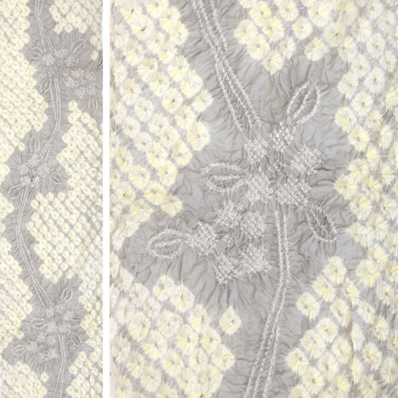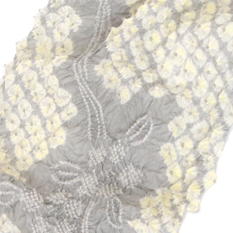 やや黄みの薄グレーの地に明るい薄黄色。小さな白の絞りを連ねた椿が曲線を描くように表現されています。明るく爽やかな色合いが魅力です。