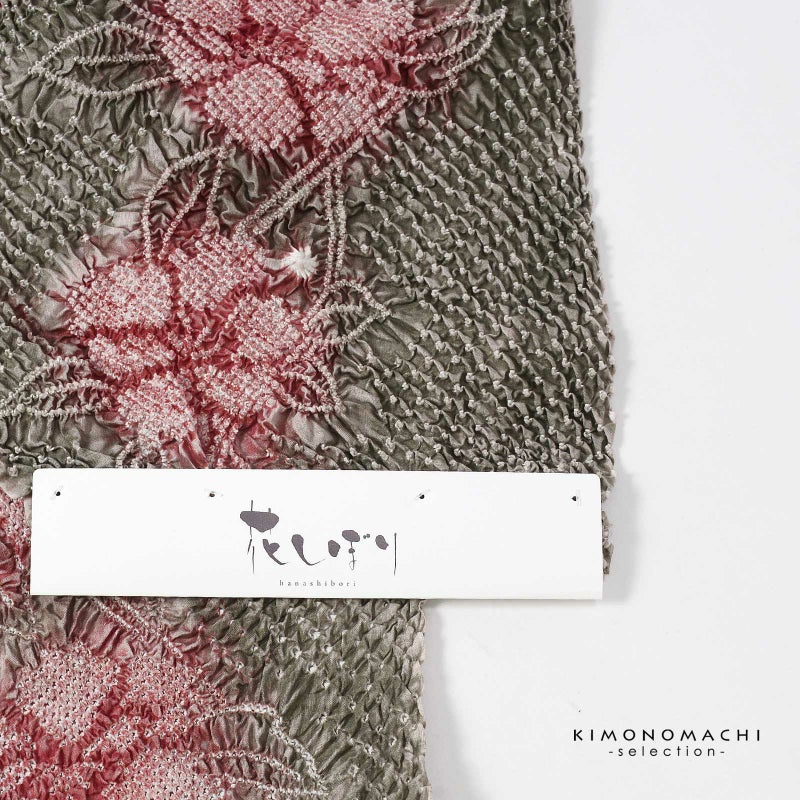 【色柄】濃淡のあるグレイッシュな抹茶色に鹿の子を並べた地。いろいろな絞りで表現された大きな花に蔓が流れるように配置されています。お花に鈍い赤の挿し色。