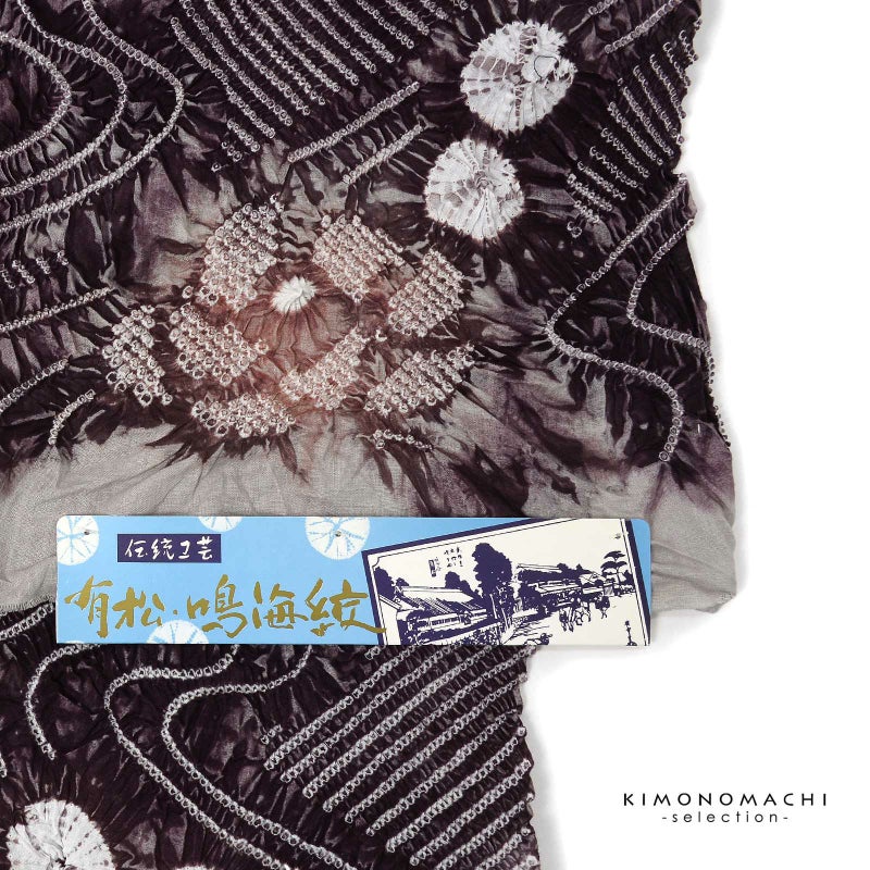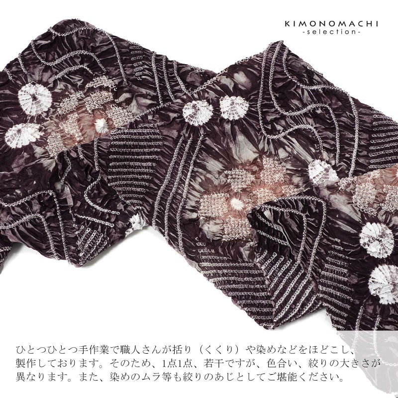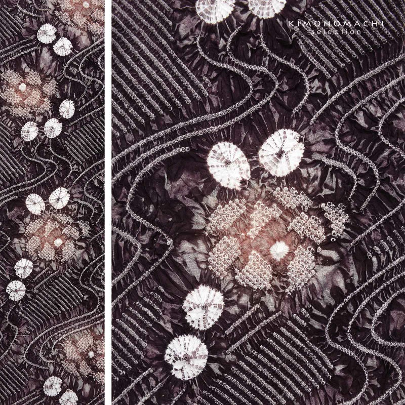 【色柄】グレイッシュな深紫色に鈍い赤紫色。細かな絞りを連ねて表現された流水にお花、絞りの水玉。