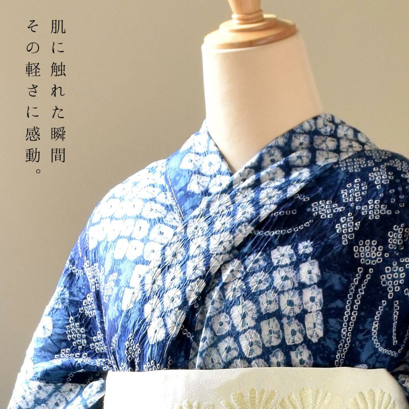 大人のお洒落な絞りの浴衣単品です。お仕立て上がりなので、すぐにご着用いただけます。絞りがやわらかで肌触りがよく、生地の凹凸があることで、肌にはり付きにくく、さわやかな着心地です。盆踊り、夏祭りにはもちろん、襦袢を合わせてちょっとしたお出かけにも、踊りなどのお稽古にもいいですね。