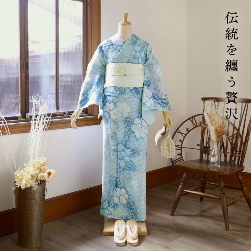 お仕立て上がり絞り浴衣単品「三浦牡丹 水色」有松絞り 女性浴衣単品 レディース浴衣単品 綿 お仕立て上がり浴衣 yukata