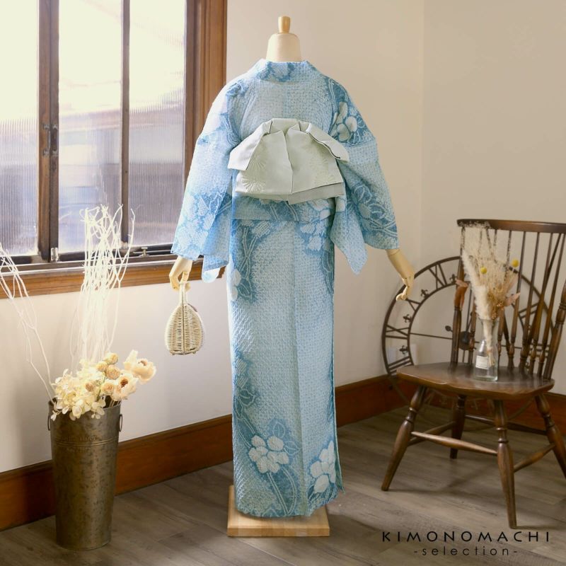 【色柄】淡い水色の三浦絞りの地。明るい水色の蜘蛛絞りの地。流れるように配された牡丹のようなかわいらしいお花。