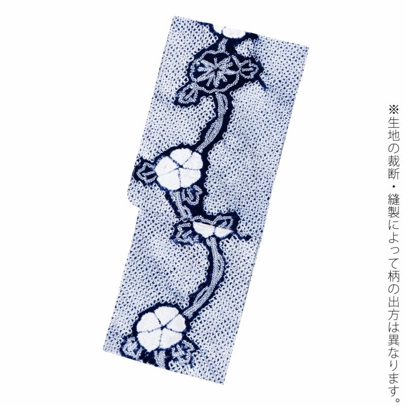 【色柄】濃紺に三浦絞りを並べた地。ひと目絞りを連ねて表現された蔓に、朝顔や白いお花が流れるように配置されています。