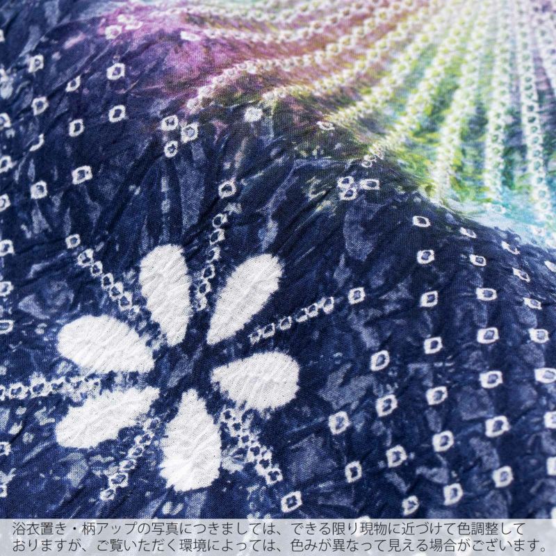 【色柄】濃淡のある紺藍に鹿の子を並べた地。細かな絞りを連ねて表現した花火の周りは紫、黄緑、水色などのグラデーション。白の絞りの小花。