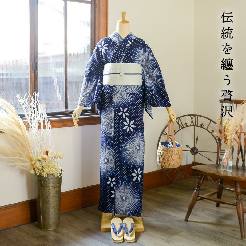 【色柄】濃紺に鹿の子を並べた地。細かな絞りを連ねて表現した花火に、白の絞りの小花。