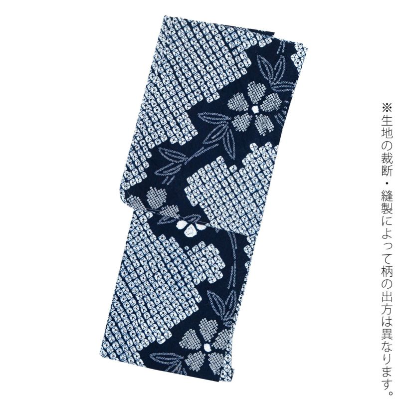 【色柄】濃紺に貝絞りを並べた地。細かな絞りを連ねて表現した五弁花に葉、茎が流れるように表現されています。