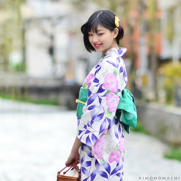 【カラー】浴衣は、淡い生成り地に、紫みのブルーの葉っぱ、お花模様。帯は、鮮やかな緑色。ハート型を三枚合わせたようなカタバミモチーフの模様。下駄は、鼻緒は白色地に濃い紺色、緑、からし色の矢羽模様。台は黒色の塗り。