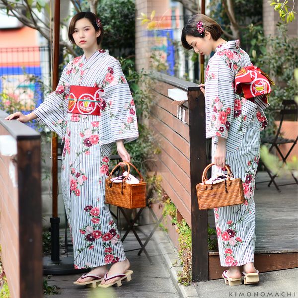 【カラー】浴衣は、白色地にネイビーのストライプ、椿模様。帯は、少し暗めの色目の濃い赤色地に千鳥、帆船、蝶の丸紋。下駄は、鼻緒は濃いめの赤色地に梅のお花模様。台は焼桐の焦げ茶色。