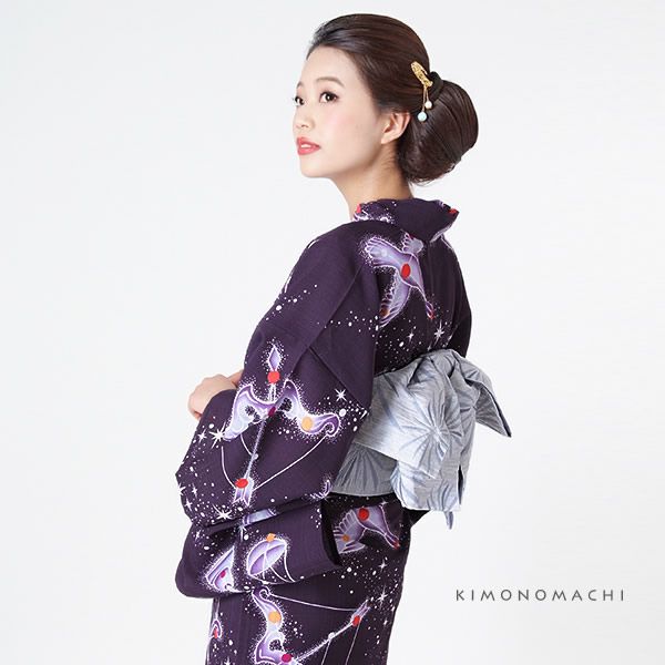 【カラー】浴衣は暗い紫紺色地に、星の輝く空をイメージ。キラキラと輝いているかのような星座モチーフ、濃淡の紫色のグラデーション。帯は白っぽい淡い鼠色地に花火模様。