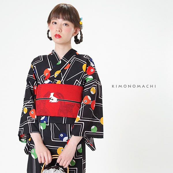 【カラー】浴衣は黒地にビリヤード台、カラフルなビリヤードの玉とキュー柄。帯は和紙風の風合いのある濃い赤色。