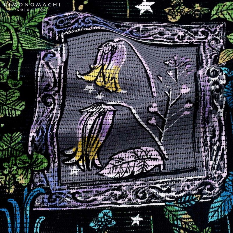 黒地にペンで描かれたかのような草花は、黄緑や鮮やかなターコイズブルーの配色。その合間に淡い藤紫色の額で飾られた牛やホタルブクロ、小鳥、スプーンなどの絵。
