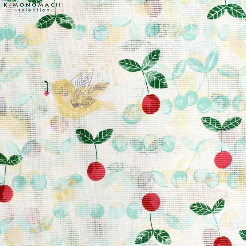 淡い白緑色の地。濃い赤色の実に深緑色の葉と軸の1つのさくらんぼ。その周りに淡い青磁色のたくさんのさくらんぼが描かれています。淡い黄土色の小鳥や小さなさくらんぼの実。