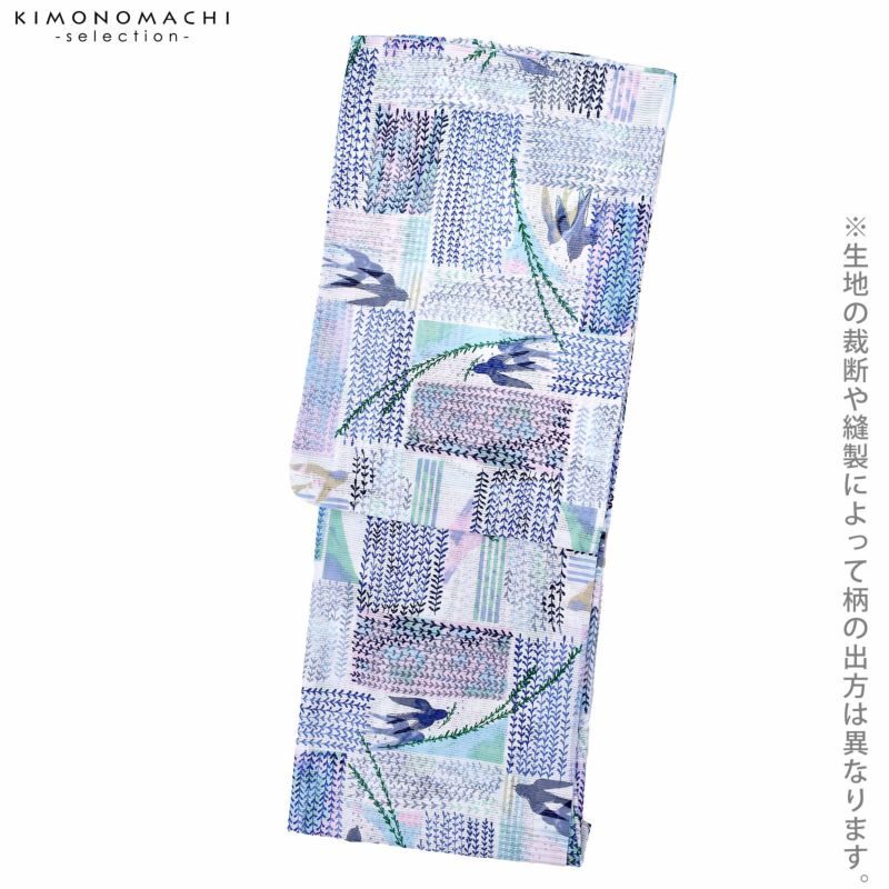 白地に縦横に配置された紺やグレー、淡い青紫などの柳の枝。藍色やグレーのツバメ。淡い緑、水色、ピンクの直線や三角形。深い緑色の柳が飛び立つツバメに添うように描かれています。