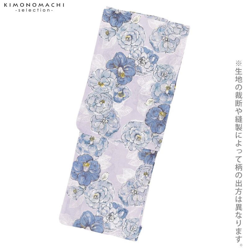 【色柄】淡いブルーラベンダー色の地に浅い黒の輪郭で表現された椿の花が流れるように配置されています。淡いブルーグレーや藤鼠色、薄緑色の配色。白抜きの葉。
