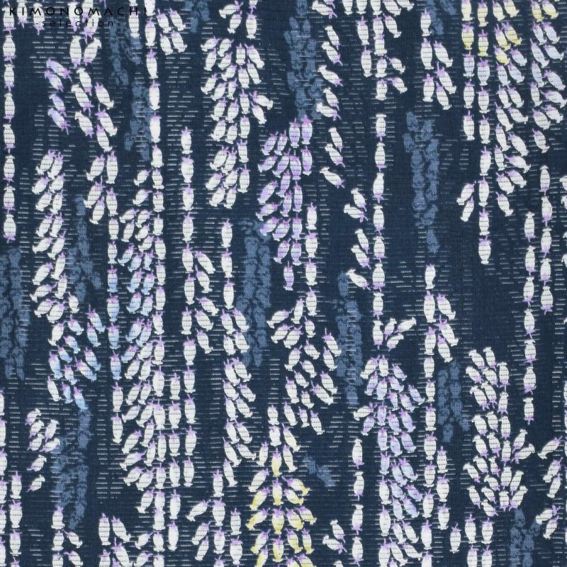 【色柄】ややグレイッシュな濃紺の地に白、薄紫に黄色、水色の挿し色の入ったアセビの花が縦向きに並んでいます。深いブルーグレーのシルエット。