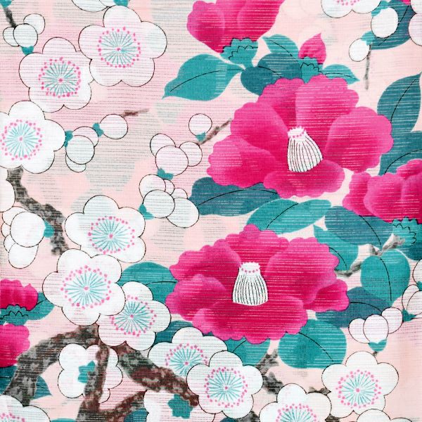 【色柄】淡いピンクの地に赤紫のぼかしの椿の花、ピーコックグリーンの葉に、白く丸いデザインの梅の花がかわいらしく現代的な印象