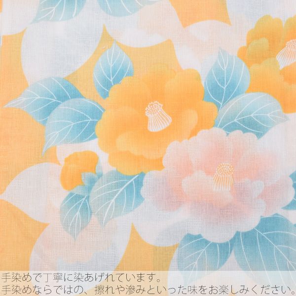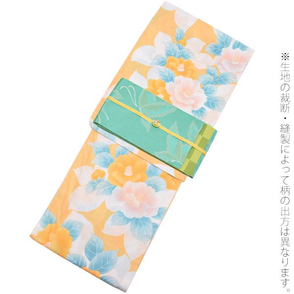 ボヌールセゾン浴衣4点セット「イエロー 椿」手捺染 三分紐、帯留めの帯飾り付き ボヌールセゾン bonheur saisons 綿麻浴衣