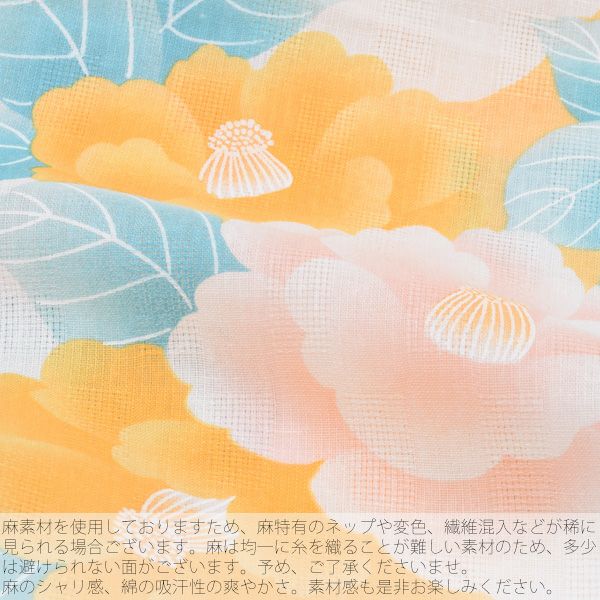 5. ボヌールセゾン浴衣4点セット「イエロー 椿」手捺染 三分紐、帯留めの帯飾り付き ボヌールセゾン bonheur saisons 綿麻浴衣 【メール便不可】