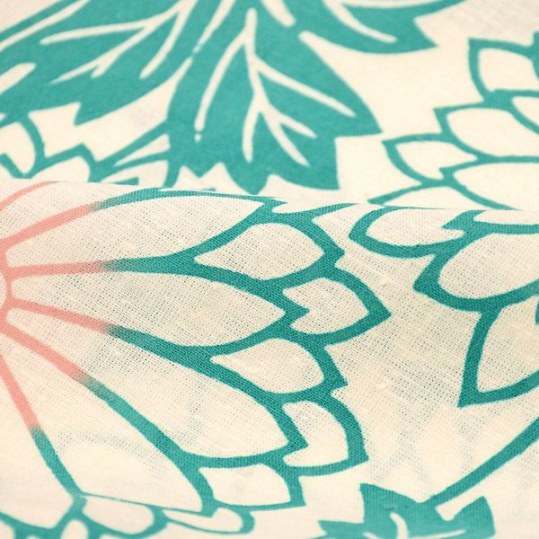 【色柄】ごく淡いクリーム色の地にターコイズで描かれたダリア、花の中心にピンクのぼかし
