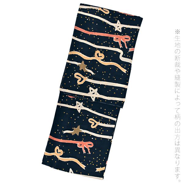 【色柄】黒地にコーラルピンク・ベージュ・カーキ・白のリボンでできたボーダー柄。端がハート型でかわいらしい印象。金とベージュのドットが星空のよう。