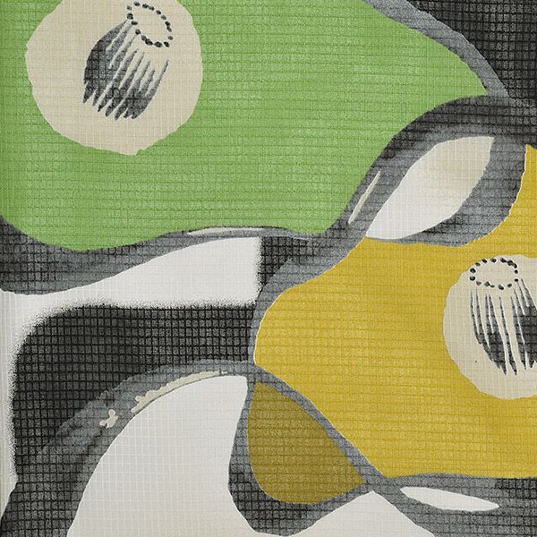 【カラー】わずかに生成りみを含んだ白色地に、墨黒のラインの椿模様。椿模様には、落ち着いた色みの緑色、からし色の色合いが入っています。