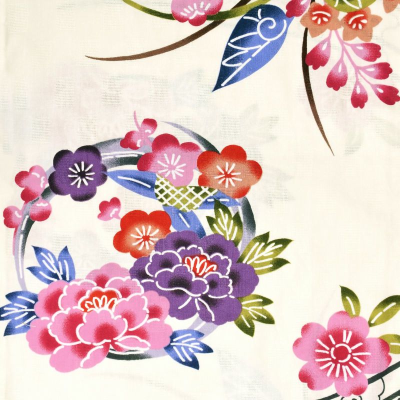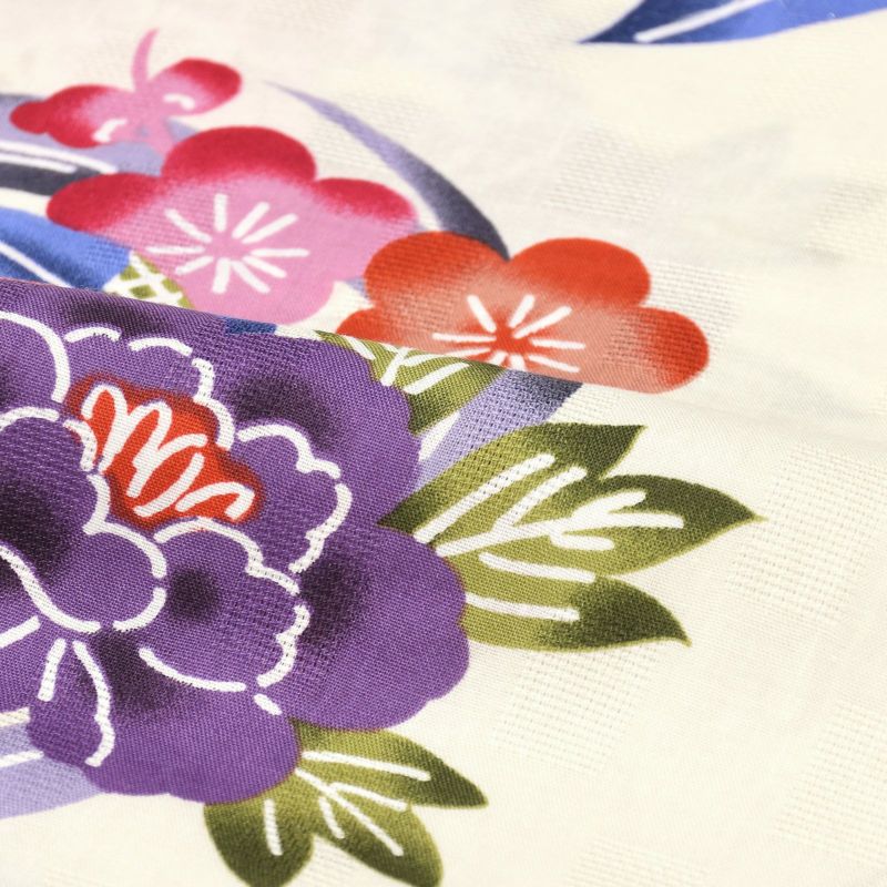 【色柄】ごく淡いクリーム色の地に牡丹や梅の花の丸、菊や葵の紅型風の花々です。ややくすんだ藤色やピンク、赤紫やオレンジなど、濃淡のぼかしがメリハリのある華やかな印象に