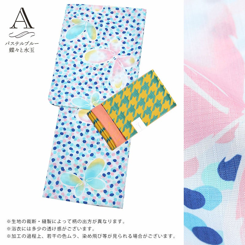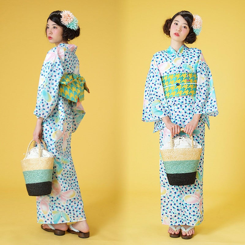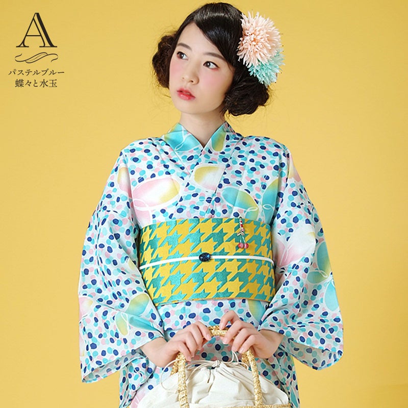 浴衣…ごく淡い水色地に、パステル調の水色・青色・ピンクの水玉模様。ピンク×黄色とブルー×黄色の蝶々柄と、ふんわりやさしい色の組み合わせがベストマッチ♪ 柄に使用している色から帯のカラーをチョイスすると、キレイになじんで、センスよく着こなせますよ。