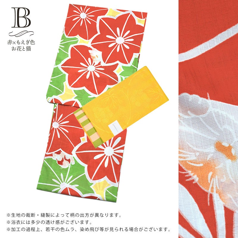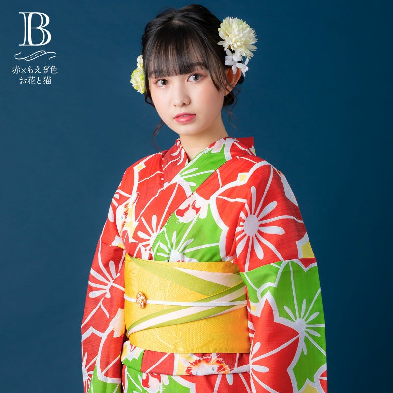 浴衣…淡い黄色地に、赤ともえぎ色のレトロなお花柄。ほんのり朱色で描かれたネコがお花の間からちょこんと顔を覗かせている様子がユニーク。ネコたちの可愛い表情にも注目! 千鳥格子の帯を結んで遊び心を活かしたスタイリングもいいし、帯の色を抑えて、柄を目立たせるのもGood。