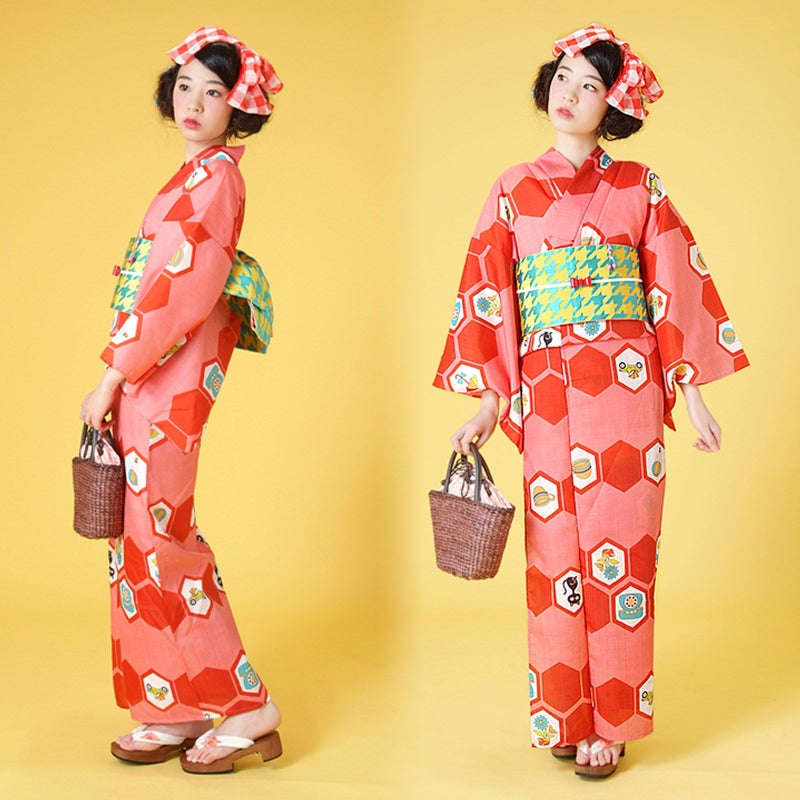 浴衣…コーラルピンク地に赤色の亀甲模様が並んだ、レトロ&モダンなデザイン。気球にコーヒーカップ、猫……ほのぼの素朴なタッチで描かれた昭和テイストのイラストが可愛い! 千鳥格子の帯がよく似合います。