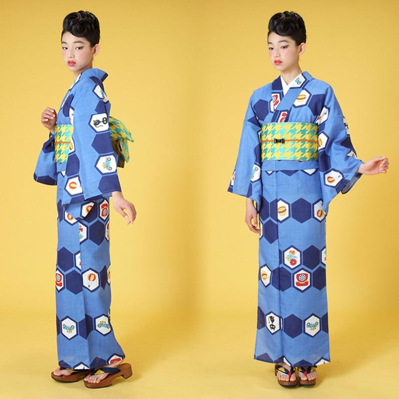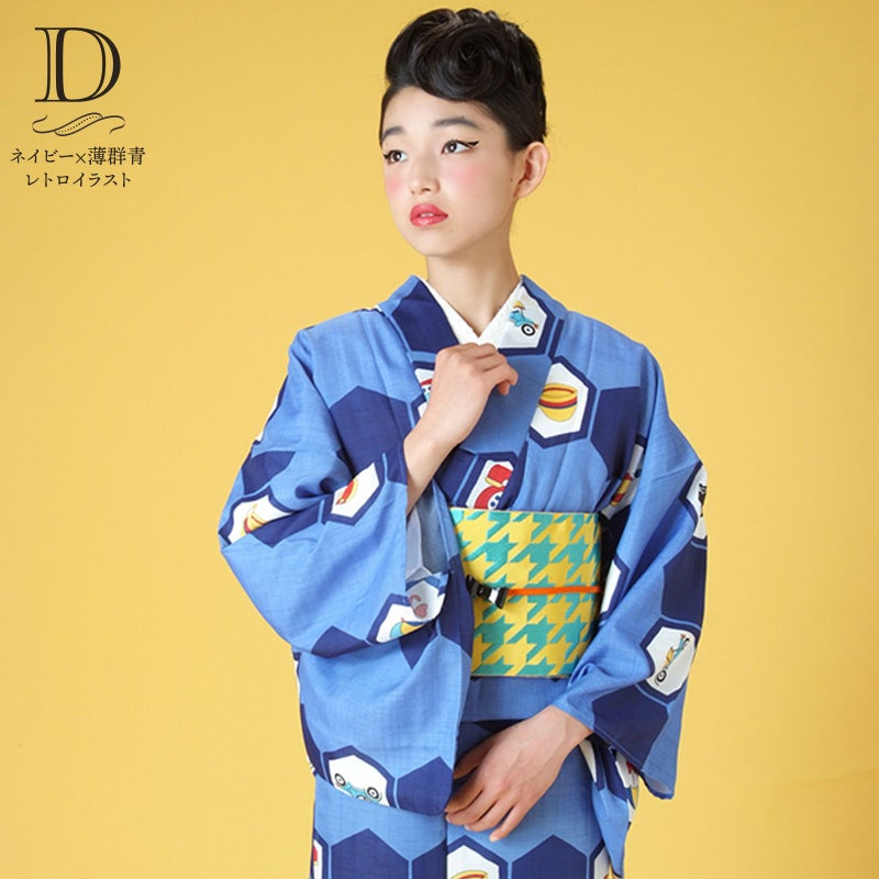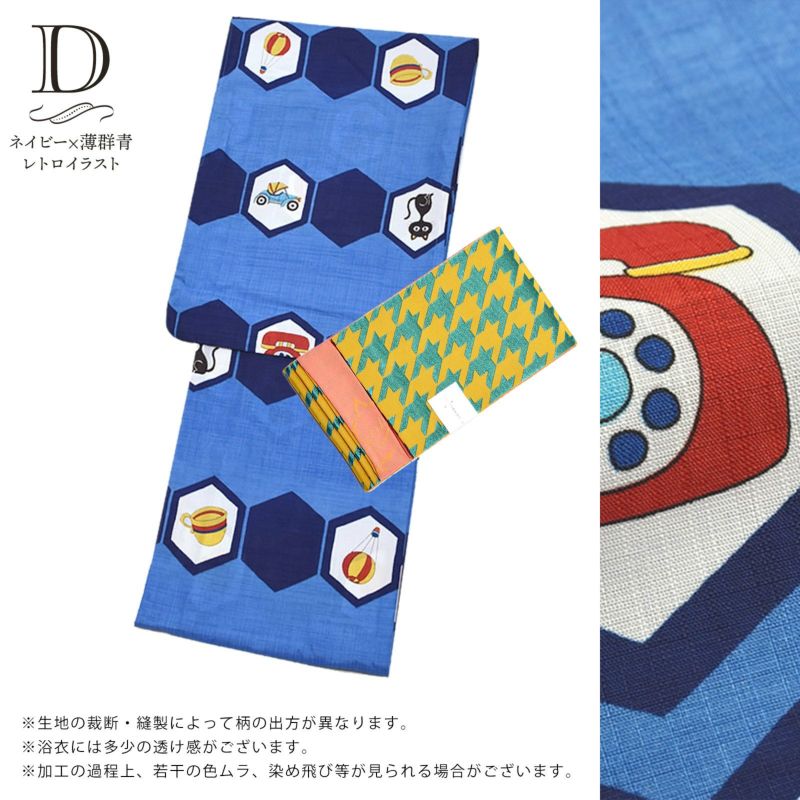 浴衣…ネイビーと薄群青、濃淡2色の青色の亀甲模様が全体に。亀甲模様の中には、電車や車、ネコなどどこかほのぼのしたタッチのイラストが描かれているのが楽しい。昭和レトロなイメージでコーディネートしたいから、帯は千鳥格子がオススメ!