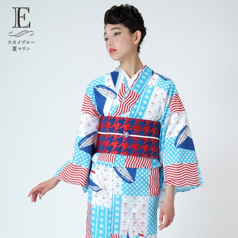 浴衣…今年は浴衣でマリンルックに挑戦! スカイブルー地に白の水玉模様や、赤×白のウェービーな縞模様、ブルーのヨットのイラストが一面に。パッチワークのようなにぎやかなデザインを活かしたいから、帯も派手めのものをチョイスして。