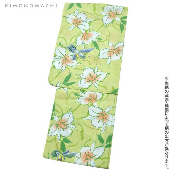 作り帯浴衣セット「グリーン ハチドリと花」S、F、TL、LL 2点セット レディース浴衣 お仕立て上がり浴衣 ポリエステル浴衣