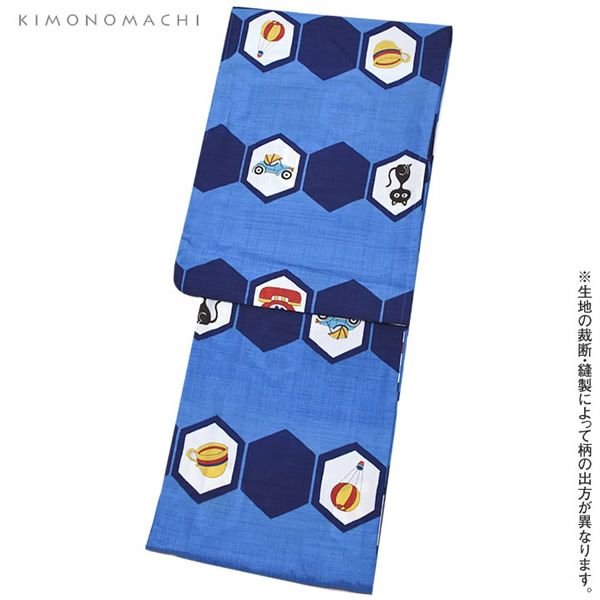 【カラー】浴衣は、ネイビーと薄群青、濃淡2色の青色の亀甲模様。亀甲模様の中には、電車や車、ネコなどのイラスト模様。帯は、黒×白色の千鳥格子模様。