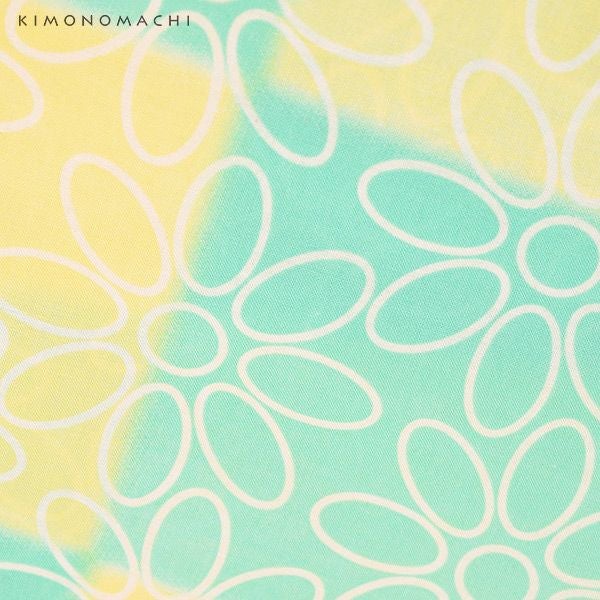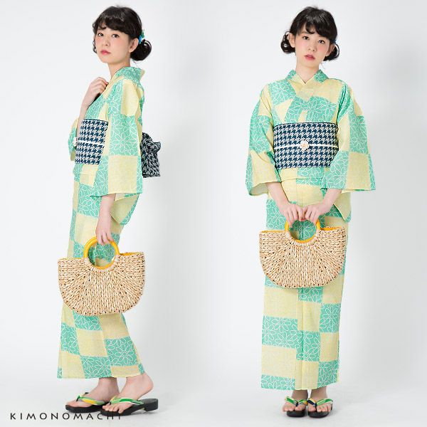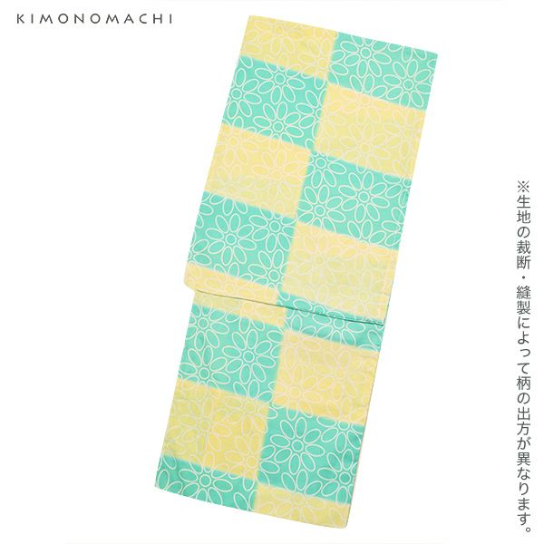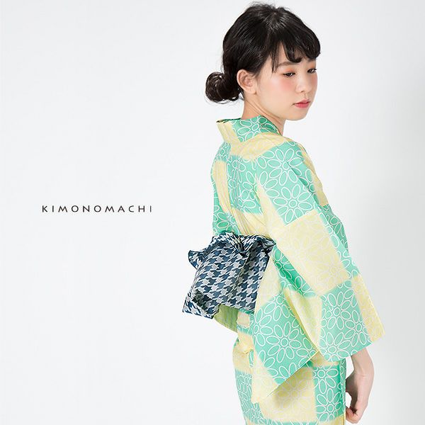 【カラー】浴衣は、四角く並んだレモンイエローとペパーミントグリーンの色の組み合わせに白色のお花模様。帯は、わずかにくすんだ浅めの青×白の千鳥格子模様。