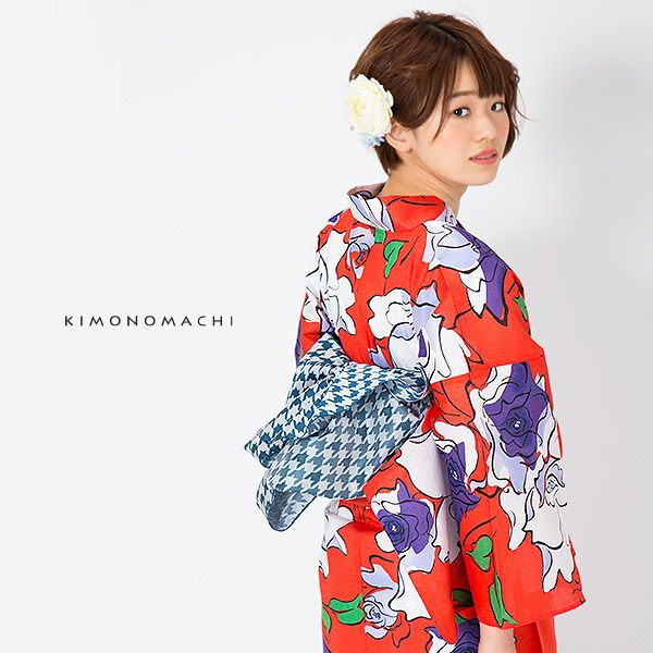 【カラー】浴衣は、オレンジ色味のある赤色地に軽く滑らかなタッチで大胆に描かれた薔薇の花模様。帯は、わずかにくすんだ浅めの青×白の千鳥格子模様。