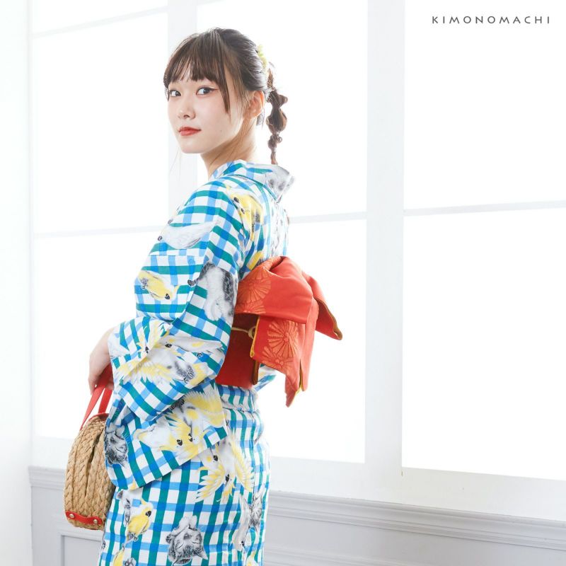 浴衣:白地に濃い緑色と水色の格子柄。格子が交差する部分が、濃い青色のアクセントになっています。格子の上全体に配された、表情豊かに動いているオウムとネコのイラストがとってもユニークで可愛らしい!中には寝ている子も。イラスト部分は、薄いグレーのラインで、猫は濃淡のグレー、オウムは白とクリームイエローの色使い。