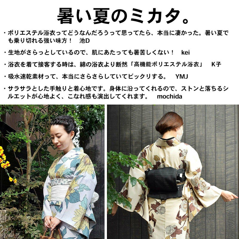 吸水速乾、高機能ポリエステル浴衣、レディース浴衣と半幅帯の2点セットです。