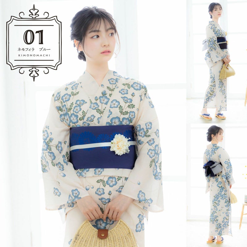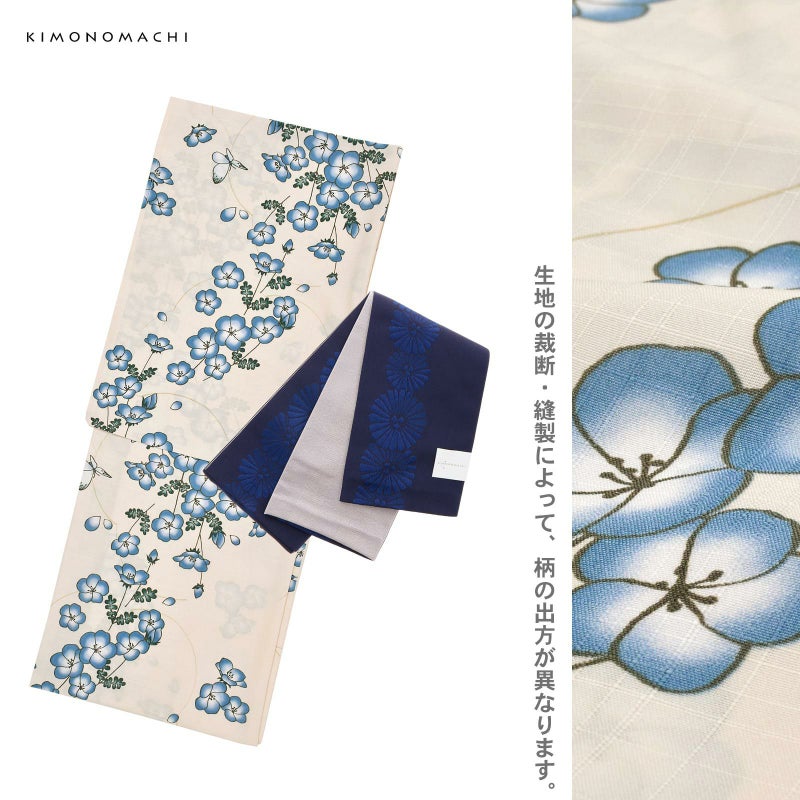 浴衣:淡いエクルベージュの地にチャコールの線で描かれたネモフィラの花々とモンシロチョウ。グレイッシュなブルーに白の花びら、ぼかしの入った青緑色の葉が爽やかな印象。蝶の羽に花と同系色の淡いブルーとグリーンの挿し色が入っています。背景の淡いカーキの線が描く花型が余白に変化をつけています。