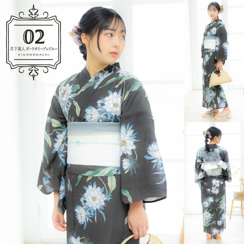 浴衣:暗めのオリーブグレー色の地にチャコールの線で描かれた月下美人の花とアゲハ蝶。グレイッシュなブルーに白の花、浅い黄緑に深い青緑と青磁色の葉の繊細な色の変化が神秘的な印象です。蝶はチャコールに淡いブルー、黄土色の挿し色。