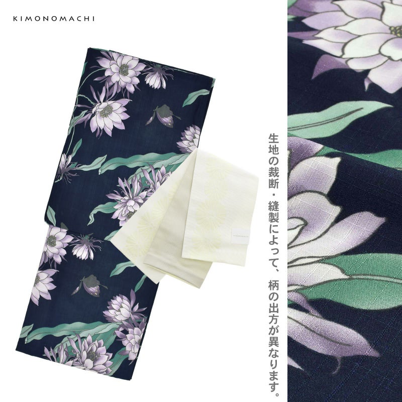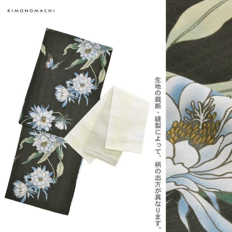 浴衣:濃紺の地にチャコールの線で描かれた月下美人の花とアゲハ蝶。ややグレイッシュな深い紫に白の花、青緑色と青磁色の葉が上品で艶やかな魅力を放ちます。蝶はチャコールに淡い紫、浅い黄色の挿し色。