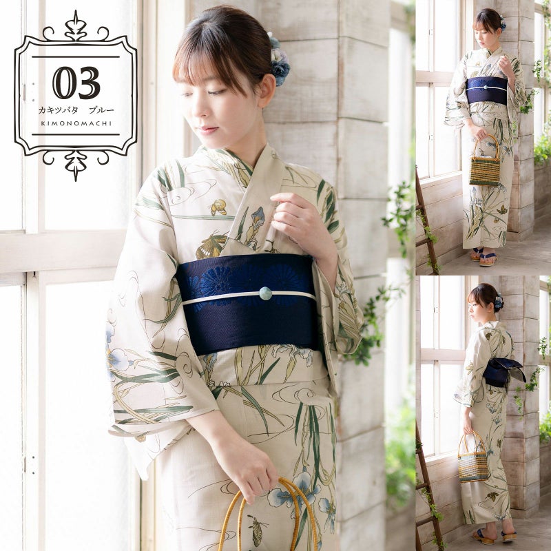 浴衣:浅い象牙色の地にチャコールの線で描かれたカキツバタとアゲハ蝶、シジミチョウ。グレイッシュなブルーに白、淡い橙色が入った花びら、浅い黄緑に深い青緑と青磁色の葉の細やかな色遣いが目を引きます。蝶は黄土色や白に深緑の挿し色。背景の流水紋が優しく上品な印象です。