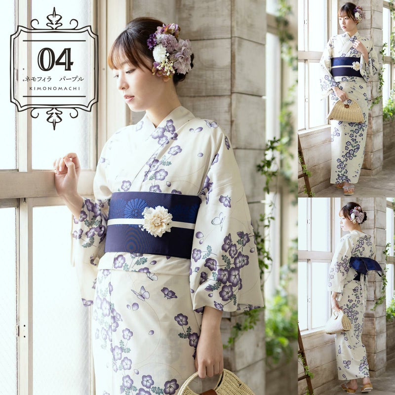 浴衣:淡くグレイッシュな薄黄緑色の地にチャコールの線で描かれたネモフィラの花々にモンシロチョウ。ややグレイッシュな深い紫に白の花びら、ぼかしの入った青緑色の葉が大人っぽい印象です。蝶の羽に花と同系色の淡いパープルとグリーンの挿し色が入っています。背景の淡いベージュの線が描く花型が余白に変化をつけています。
