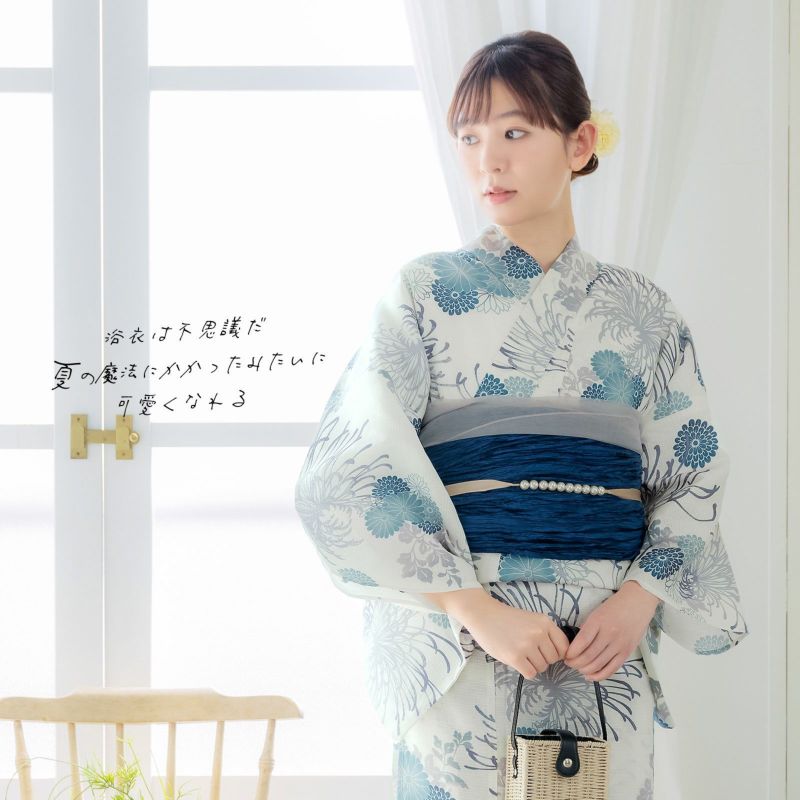 浴衣:アイボリーの地に、グレーと青紫のぼかしの入った大きな糸菊の花。紺や浅葱色、ブルーグレーの菊の花紋にグレーの葉。糸菊の繊細な華やかさとシックな配色が大人っぽい雰囲気です。