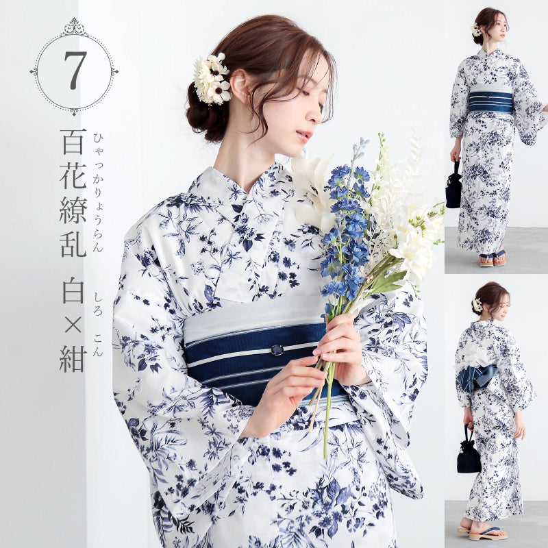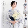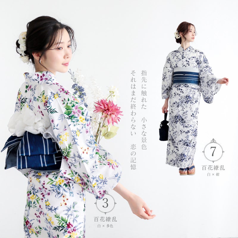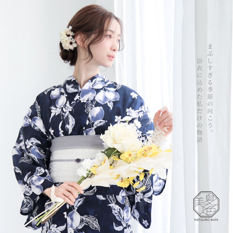 浴衣:白地に濃紺、くすんだブルー、浅い紺のボタニカル柄。花束のように大事に持ち続けたい愛おしい思い出を表現したデザインです。