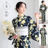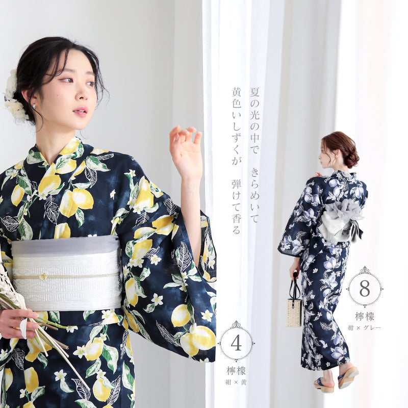 浴衣:濃紺に浅い紺のぼかしの地。鮮やかなイエローのレモンの実に白い花、緑の葉が縦向きに配置されています。夏のきらめき、みずみずしい空気を感じさせるデザインです。