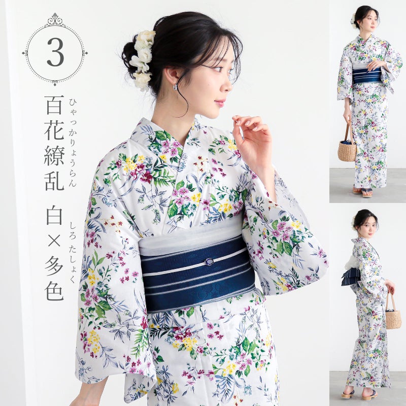 浴衣:白地に赤紫や黄色、緑、浅い紺のボタニカル柄。ずっと記憶に留めたい明るい風景を思い起こさせる小花のデザインです。