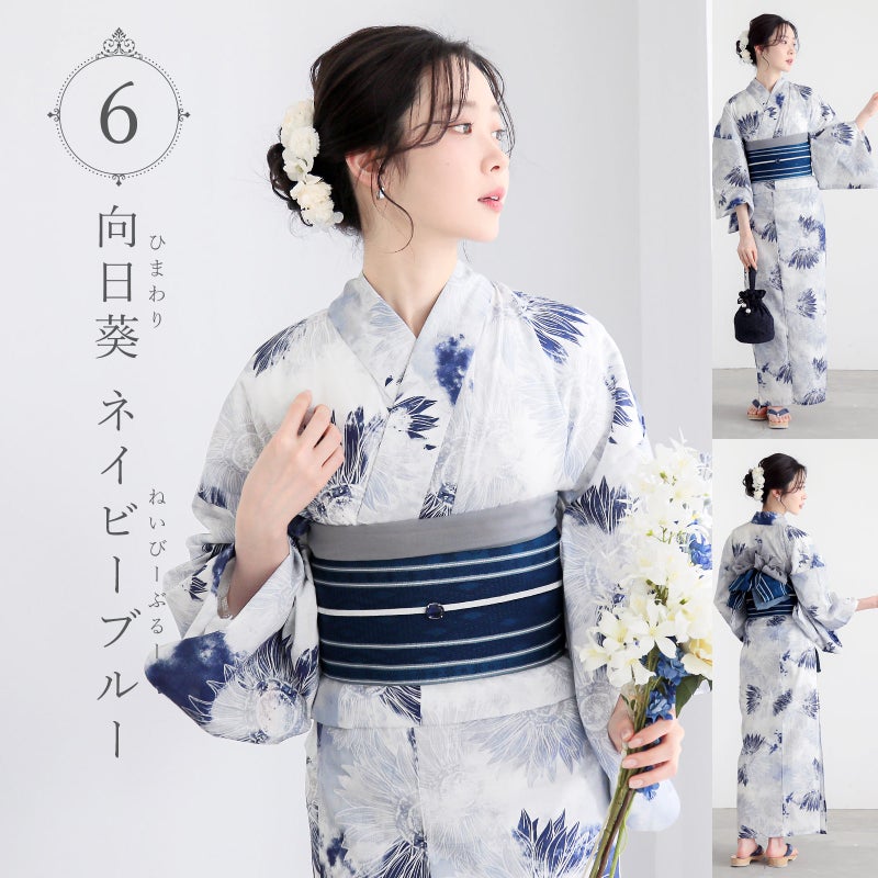 浴衣:白に深い紺、ライトグレー、くすんだブルーが入り混じったぼかしの地。白の線で表現された手描き調のヒマワリの花。夏の強い光にかき消された思い出の輪郭をなぞるようなデザインです。