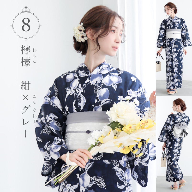 浴衣:濃紺に浅い紺のぼかしの地。白にくすんだパープルグレーのレモンの実に花、紺の葉が縦向きに配置されています。雨露を受けていっそう鮮烈に香り立つ檸檬のような印象深いデザインです。