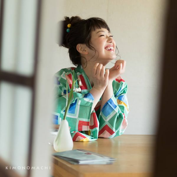 【カラー】浴衣はコバルトグリーンをベースに、規則的に並んだちょっとスモーキーな赤×ピンク、黄色×からし色、濃淡のブルーのタイル模様。ちょっぴりレトロな可愛らしさが漂うデザイン。帯は赤ピンクの細かな縞模様。