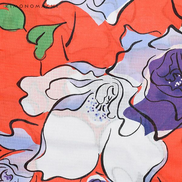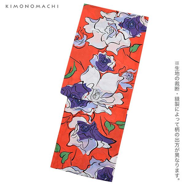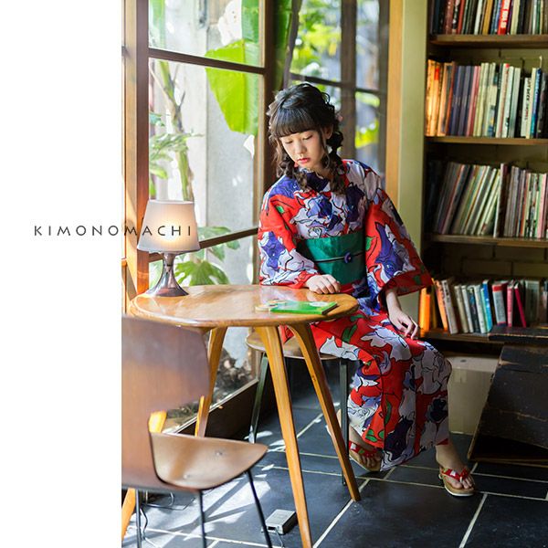 【カラー】浴衣はオレンジ色味のある赤色地に軽く滑らかなタッチで大胆に描かれた薔薇の花模様。帯は鮮やかな緑色、カタバミモチーフの模様。